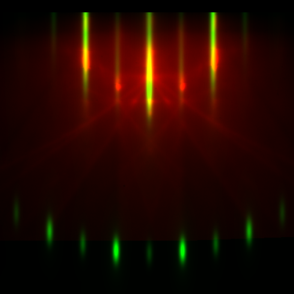 Users can compare simulated and experimental RHEED images. This example shows simulated (green) and experimental (red) data overlaid for MgO cut along 001 plane.